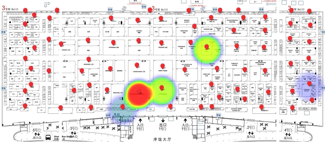 3. 主办方可以实时掌握展馆公共区域内(布置了设备的区域)的人群分布,密度和变化趋势。根据这些信息可以进行安全预警,在人流密度过大时及时进行人流疏散